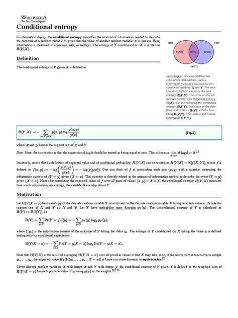 What does this tell us? The total uncertainty of two variables is the uncertainty of one variable plus the uncertainty remaining in the second variable after we know the first one. This formula is incredibly insightful! It shows that conditional entropy \(H(Y|X)\) is always less than or equal to the entropy of \(Y\) , \(H(Y)\) : \(H(Y|X) \leq H(Y)\) . This means knowing \(X\) never increases the uncertainty about \(Y\) ; it can only decrease it or leave it unchanged if \(X\) and \(Y\) are independent. This is the core idea – knowledge reduces uncertainty. The difference \(H(Y) - H(Y|X)\) is known as the mutual information , denoted \(I(X; Y)\) . Mutual information measures exactly how much information \(X\) and \(Y\) share. It tells you, on average, how many bits of information you gain about \(Y\) by knowing \(X\) . So, \(I(X; Y) = H(Y) - H(Y|X)\) . This is a super important concept in its own right, directly quantifying the dependence between variables. If \(X\) and \(Y\) are independent, then \(H(Y|X) = H(Y)\) , and thus \(I(X; Y) = 0\) , meaning they share no information. If \(Y\) is a deterministic function of \(X\) , then \(H(Y|X) = 0\) , and \(I(X; Y) = H(Y)\) , meaning all the information in \(Y\) is contained in \(X\) . These relationships are not just mathematical curiosities; they are the foundation for understanding information flow, channel capacity, and the fundamental limits of communication. They allow us to quantify, optimize, and design systems with incredible precision. So, while conditional entropy might sound complex, its properties reveal elegant truths about how information is related and transmitted. Keep these relationships in mind, and you’ll find yourself seeing the interconnectedness of data in a whole new light!