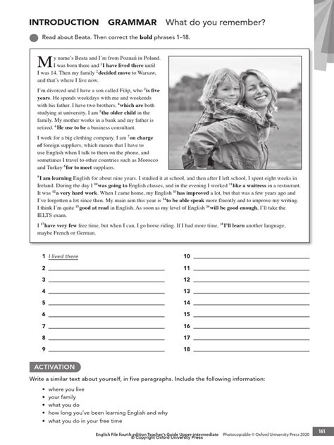 Think of the Workbook as your personal trainer for English. It provides extra practice to reinforce what you learn in the Student’s Book . Each unit in the Workbook corresponds to a unit in the Student’s Book , offering a range of exercises to help you consolidate your understanding of grammar, vocabulary, and pronunciation. The Workbook is designed to be used both in class and at home, giving you the flexibility to study at your own pace. It includes a variety of activities, such as gap-fill exercises, multiple-choice questions, and writing tasks. These exercises are designed to test your knowledge and help you to identify any areas where you may need further practice. One of the key benefits of the Workbook is that it provides immediate feedback. Many of the exercises include answer keys, allowing you to check your work and see how you are progressing. This helps you to stay motivated and track your improvement over time. The Workbook also includes audio exercises to help you improve your listening comprehension skills. These exercises often involve listening to dialogues or monologues and answering questions about what you have heard. This is an important skill for anyone learning English, as it helps you to understand native speakers and communicate effectively in real-world situations. In addition to grammar and vocabulary exercises, the Workbook also includes pronunciation practice. This involves listening to words and phrases and repeating them to improve your pronunciation. This is an important aspect of language learning, as it helps you to speak more clearly and confidently. Overall, the Workbook is an essential tool for anyone studying English File 4th Edition Upper-Intermediate . It provides extra practice, immediate feedback, and opportunities to improve your grammar, vocabulary, pronunciation, and listening comprehension skills. By using the Workbook regularly, you can reinforce your learning and achieve your language learning goals.