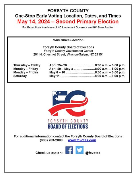 Generally, early voting locations are open during regular business hours, and some locations may also offer extended hours, including evenings and weekends, to accommodate different schedules. These extended hours can be particularly helpful for individuals who work during the day or have other commitments that make it difficult to vote during standard business hours. By checking the Forsyth County Elections Office website, you can find the specific hours for each early voting location and choose a time that works best for you. Remember, planning ahead and knowing the exact dates and times for early voting will help you make the most of this convenient voting option and ensure your voice is heard in Forsyth County.