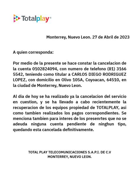 Next, pay close attention to the cancellation policy . This section will detail the exact steps you need to take to initiate the cancellation. For instance, it might specify whether you need to submit a written request, call a customer service hotline, or visit a Totalplay store in person. Some contracts require a notice period, meaning you need to inform Totalplay of your intent to cancel a certain number of days (e.g., 30 days) before your desired cancellation date. Missing this deadline could result in additional charges or a delay in the cancellation process.