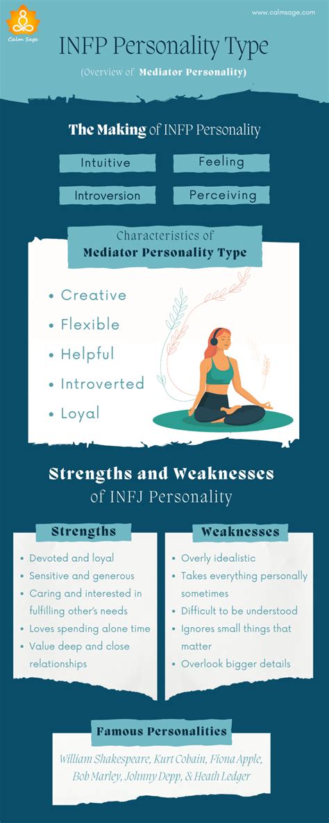 INFPs are also known for their loyalty and commitment to their friends, family, and loved ones. They are supportive and encouraging, always there to offer a listening ear or a helping hand. However, INFPs can also struggle with certain challenges. For example, they may have difficulty dealing with conflict or criticism. They are sensitive to criticism. They may struggle with perfectionism . They can become overwhelmed by the complexities of the world. INFPs can also be prone to overthinking. They may take on too much and experience burnout. They can become lost in their own thoughts. They are known for being highly individualistic and often feel different from others. They embrace their uniqueness and are not afraid to stand out from the crowd. They are driven by a desire to create a world where their values of authenticity, compassion, and meaning are reflected. Recognizing these characteristics helps you better understand the INFP personality type.
