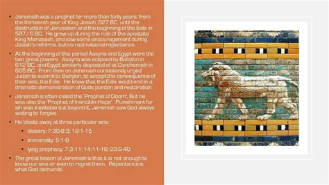 Before we plunge into the book, let’s get to know the man himself. Jeremiah was a prophet in Judah during a really turbulent time, around the late 7th and early 6th centuries BC. Think political upheaval, looming threats from empires, and spiritual crisis . Not exactly a chill gig, right? He was called by God to deliver some tough messages to the people of Judah, messages they often didn’t want to hear. Understanding his historical context is key because it colors everything he says and does. He wasn’t just some dude spouting random stuff; he was directly addressing the sins and idolatry of his society, warning them of impending doom if they didn’t shape up. What’s fascinating is that Jeremiah himself wrestled with his calling. He felt inadequate, young, and overwhelmed by the task God set before him. This internal struggle makes him incredibly relatable. I mean, who hasn’t felt like they’re in over their head at some point? Despite his reservations, Jeremiah remained faithful, delivering God’s word even when it meant facing rejection, persecution, and imprisonment. His life is a testament to the power of obedience, even when it’s hard, and a stark reminder that following God’s call isn’t always easy but it’s always significant. The personal cost Jeremiah bore is evident throughout the book. He wasn’t just reciting prophecies; he was living them, embodying the pain and sorrow of God over his people’s unfaithfulness. This emotional depth is what makes Jeremiah such a powerful and enduring figure in the biblical narrative. Think about it: he’s not just telling people what’s going to happen; he’s feeling it with them, mourning their choices, and pleading for their repentance . It’s this profound empathy, combined with unwavering conviction, that cements Jeremiah’s legacy as one of the most important prophets in the Old Testament.