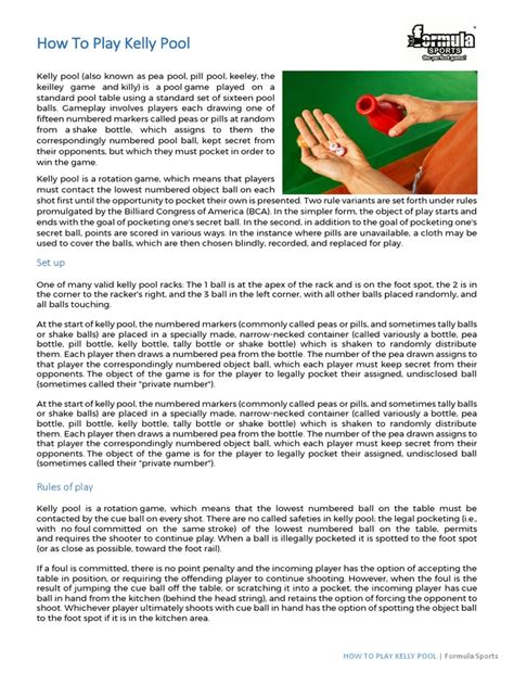 We’ve talked a lot about the game, but let’s circle back to that Kelly Pool rules printable we promised! Having a clear, concise, and easily accessible set of rules is invaluable, especially in a game with as much strategic depth as Kelly Pool. Imagine this: you’re in the middle of an intense game, a debate erupts about whether a particular shot was legal or what the penalty is for a scratch. Instead of trying to recall complex rules from memory or spending precious game time searching online, you can just whip out your printable Kelly Pool rules . It’s your instant reference guide, ensuring fair play and keeping the game flowing smoothly. This printable sheet can cover everything we’ve discussed: the objective of the game, the ball assignments, how to break, legal shots, fouls, penalties, and even a section for agreed-upon house rules. It’s perfect for new players trying to get up to speed quickly or for experienced players who just want a refresher. You can print it out and keep it near the table, perhaps even laminated for durability if you play often. It helps standardize games among different groups and prevents common misunderstandings that can lead to frustration. Think of it as your Kelly Pool cheat sheet – a tool to enhance the enjoyment and integrity of your games. So, when you’re looking for Kelly Pool rules printable , you’re really looking for a way to elevate your game nights, making them more organized, competitive, and most importantly, more fun for everyone involved. It ensures that the focus remains on the skill and strategy of the game, rather than getting bogged down in rule disputes. Grab that printable, gather your friends, and get ready for some epic games of Kelly Pool!