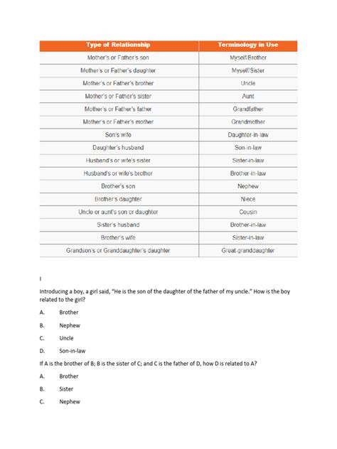 Alright guys, now that we’ve got the basics down, let’s tackle some common types of blood relation questions pdf you’ll encounter. These often come in a few flavors, and knowing how to approach each one can save you a ton of time and mental energy. The first type is the straightforward statement-based puzzle. For example: “Pointing to a photograph, a man said, ‘I have no brother or sister, but that man’s father is my father’s son.’ How is the man in the photograph related to the man who spoke?” This kind of question requires careful decoding. Let’s break it down. The speaker says, “I have no brother or sister.” This is a critical piece of information. Then he says, “that man’s father is my father’s son.” Since the speaker has no siblings, his father’s son can only be himself . So, the statement simplifies to: “that man’s father is me .” Therefore, the man in the photograph is the speaker’s son. See how breaking it down makes it manageable? Always look for these simplifying clauses! Another common type involves a series of connected statements. For instance: “A is B’s brother. C is A’s mother. D is C’s sister. E is D’s son. How is A related to E?” Let’s draw this out.