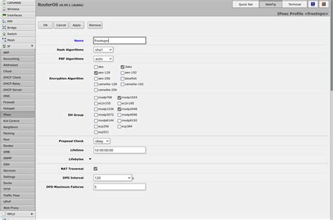 Now, let’s get down to the nitty-gritty. What are the actual components that make up a MikroTik IPsec profile ? Understanding these will help you make informed decisions when configuring your tunnels. The first big one is the Encryption Algorithm . This is what scrambles your data so that if someone intercepts it, they can’t read it. Common choices include AES-128, AES-192, and AES-256, with AES-256 being the strongest and most recommended. The higher the bit number, the more complex the encryption, and generally, the more secure it is. Next up, we have the Hash Algorithm (also known as the integrity algorithm). This ensures that the data hasn’t been tampered with during transit. Think of it as a digital fingerprint for your data packets. Popular options include SHA1 (though it’s getting a bit dated and less secure), SHA256, SHA384, and SHA512. Again, the higher the number, the stronger the integrity check. Then there’s the Diffie-Hellman (DH) Group . This is used during the initial key exchange process to securely agree upon a shared secret key between the two endpoints of the tunnel. Different DH groups offer varying levels of security and computational overhead. Groups 14, 19, 20, and 21 are commonly used and offer good security. Older groups like 1, 2, and 5 are generally considered weaker and should be avoided if possible. The PFS (Perfect Forward Secrecy) option is another critical setting. When enabled, PFS ensures that if a long-term secret key (like your pre-shared key or certificate) is compromised, past communication sessions remain secure. This is because each session uses a unique, ephemeral session key derived through the DH exchange. Enabling PFS adds an extra layer of security, albeit with a slight increase in CPU usage during the connection establishment. Finally, we have Key Lifetime . This determines how long an IPsec Security Association (SA) will be valid before it needs to be re-negotiated. Shorter lifetimes mean more frequent re-keying, which can slightly increase overhead but also limits the window of opportunity for an attacker if a key were somehow compromised. Typical values range from 1d (one day) to 8h (eight hours). These components work together to create a robust security framework for your IPsec tunnel. Choosing strong, modern algorithms and enabling PFS are key to a secure setup. It’s all about finding that sweet spot between security and performance for your specific network needs, guys.