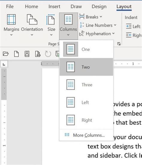 In the Layout tab, look for the “Columns” button. Click on it, and you’ll see a dropdown menu with several preset column options, like one, two, three, or even more columns. You can also choose “Left” or “Right” to create a column layout with one narrow column on either side.