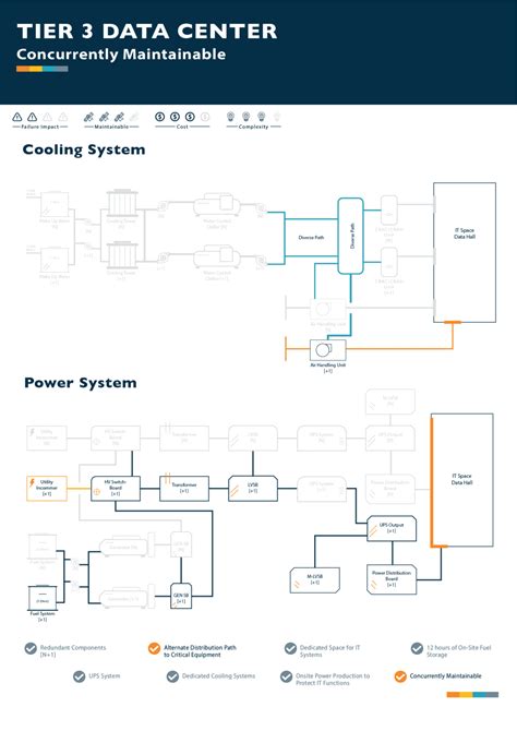 Alright, let’s get down to the nitty-gritty of what you’ll actually see on a Tier 3 data center diagram . This is where the magic happens, folks. The primary goal of a Tier 3 facility, as dictated by the Uptime Institute’s standards, is to ensure concurrent maintainability . What does that mean in plain English? It means you can take any component offline for maintenance or replacement without impacting the IT operations. No downtime, no sweat! The diagram visually represents how this is achieved through multiple, independent distribution paths for power and cooling, with no single point of failure . You’ll notice distinct sections on the diagram dedicated to power infrastructure. This typically includes utility feeds, uninterruptible power supplies (UPS), backup generators, and the various switchgear and distribution panels. For Tier 3, you’ll see at least two active power paths, meaning that everything is powered by two independent sources simultaneously. If one utility feed goes down, the other keeps everything running. The UPS systems are like the pit crew for your servers, instantly kicking in during the split second it takes for the generators to spin up and take over. Generators, often N+1 redundant, are a huge part of this. This ‘N+1’ concept is something you’ll see repeated throughout a Tier 3 diagram – it means you have the ‘N’ number of components needed to run the facility, plus one extra for redundancy. So, if one generator fails, you still have enough to keep the lights on and the servers cool. The cooling systems are equally critical. You’ll see diagrams illustrating redundant chillers, pumps, and Computer Room Air Conditioners (CRACs) or Computer Room Air Handlers (CRAHs). Just like power, cooling paths are also designed with redundancy, ensuring that even if a cooling unit needs maintenance, the others can handle the load. Networking is another key area. While the diagram might not show every single cable, it will illustrate the redundant network entry points, core switches, and multiple paths to the server racks. This ensures that if one network link or piece of equipment fails, data can still flow through an alternate route. Security is also paramount, often shown with layers of physical access controls, surveillance systems, and environmental monitoring. It’s a symphony of systems, and the diagram is the conductor’s score. Keep an eye out for these elements as we go deeper!