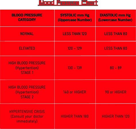 Let’s get down to the nitty-gritty! Here’s a chart that breaks down the different blood pressure categories, according to guidelines from organizations like the American Heart Association. Knowing where you fall in these ranges is super important for understanding your risk and taking the right steps to stay healthy. Remember, these are general guidelines, and your doctor might have specific recommendations based on your individual health profile.